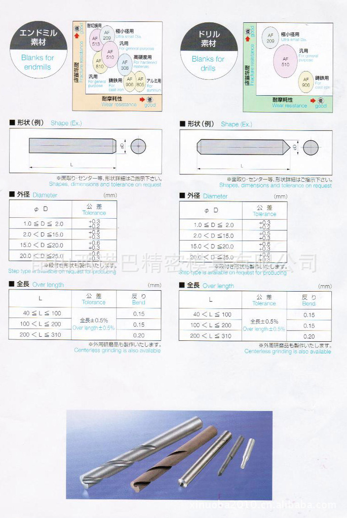 | 材種 | 粒径 μm | Co量 (wt%) | 坑折力 GPa | 硬度 HRA | 特 長 | 適用製品 | 超 々 微 粒 | AF209 | 0.2 | 9.0 | 4.0 | 93.5 | 世界最微粒径の超々微粒合金 | 極小径PCBドリル 微小径ドリル?エンドミル | AF312 | 0.3 | 12.0 | 4.4 | 92.5 | 世界最高強度の超々微粒合金 | 小径PCBドリル | AF310 | 0.3 | 10.0 | 4.1 | 93.0 | 高い強度と耐摩耗性の超々微粒合金 | 小径PCBドリル ルーター | AF308 | 0.3 | 8.0 | 3.8 | 93.6 | 高い耐摩耗性を持つ超々微粒合金 | PCBドリル 高硬度用エンドミル | 超 微 粒 | AF513 | 0.5 | 13.0 | 4.2 | 91.4 | 靱性に優れた超微粒合金 | 耐切損用エンドミル?ドリル タップ リーマ | AF510 | 0.5 | 10.0 | 4.0 | 92.4 | 耐摩耗性、靱性に優れた超微粒合金 | 汎用エンドミル?ドリル | AF505 | 0.5 | 5.0 | 3.6 | 93.6 | 耐摩耗性に優れた超微粒合金 | PCBドリル,ルータ | 微 粒 | AF810 | 0.8 | 10.0 | 3.8 | 91.4 | 強度,靱性に優れた微粒合金 | エンドミル?ドリル | AF806 | 0.8 | 6.0 | 3.5 | 93.0 | 高速加工用,耐摩耗性,耐チッピング性 に優れた微粒合金 | PCBドリル | AF805 | 0.8 | 5.0 | 3.3 | 93.2 | 耐摩耗性に優れた微粒合金 | アルミ用エンドミル?ドリル リーマ | AF906 | 0.9 | 6.0 | 3.4 | 92.4 | 硬度?強度のバランスに優れた微粒合金 | 鋳鉄用エンドミル?ドリル |