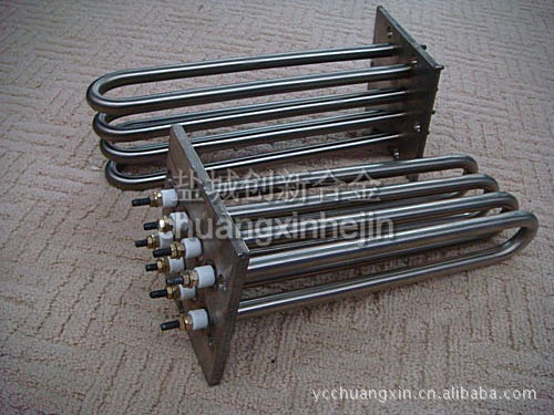不锈钢加热管指管状电加热元件的结构是在一金属管内放入电热丝,并在空隙部分紧密地填充有良好的导热性和绝缘性的结晶氧化镁。电热丝两端是通过两个引出棒与电源相接,可以加热静止或流动的空气、并能熔炼轻金属及金属模具和各种液体。它具有结构简单,机械强度高、热效率高、安全可靠、安装简便、机械强度好、使用寿命长,可以弯成各种形状等特点。