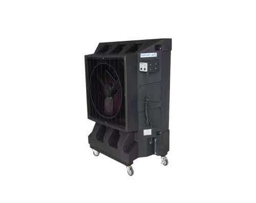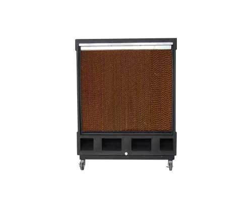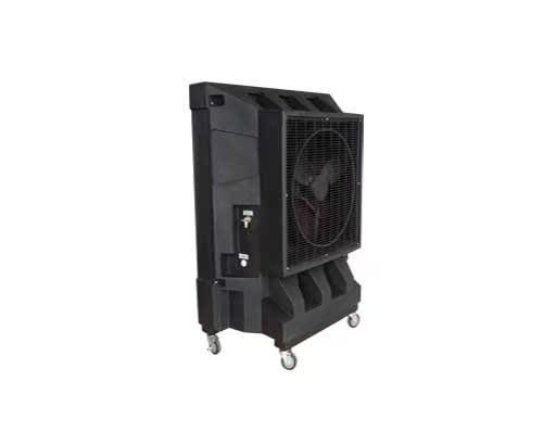 其降温原理为:通过风机抽风,机内产生负压,同时水泵把水输送到布水器上,水均匀地湿润整个湿帘的表面,而且湿帘的特殊角度使水流直接流向空气进风的一侧,热空气经过被水淋湿的湿帘,吸收空气中大量的热量,使通过湿帘的空气温度降低,同时得到过滤,使送出的风变得凉爽、湿润而且清新。而未蒸发的水回落底盘,形成水路循环。
