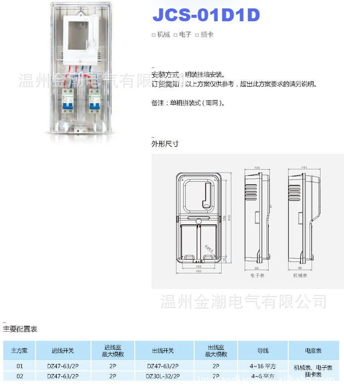 JCELE系列电表箱造型设计美观、线条流畅,箱盖透明清晰,箱内表位、电器元器件位置布局合理,可任意安装各种型号的电器元器件,集抄采集线器等。箱盖采用三向挂钩推进连接箱体,在箱体盖电表位下中部设专用铅封螺丝装置,箱盖下部用铅封螺丝及挂锁与箱体固定互锁,只有电管人员专用铅封螺丝反手和钥匙才可开启。箱盖的全透明方便电管人员清晰读数抄表和及时可直接观察到箱内的各类异常现象。从而提前排除用电中的隐患,实现“安全用电,预防为主”的管理目标。