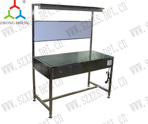你好,鑫众盛专业生产印刷厂、线路板厂、电子厂菲林检测用的QC菲林检测光桌,QA拼版光桌(台)。是一家具有八年生产经验的生产厂家,拥有设计、剪板折弯、焊接、抛光、烤漆、电工组装。产品采用不锈钢或钢板烤漆防锈材料,检测光桌外尺寸:L1200*W600*H1300透光面:1140*540mm,拼版台外尺寸:L1220*W1150*H950(可按要求定做)荧光:40W*4重量:60kg适用无尘室标准值,绿博士28W护眼灯,外加防紫外线灯罩,全面式反射板,使桌面光线均匀明亮,可简易工程检查软片细线路、纲版。我厂自产自销,免费保修两年,售后免费服务电话:4008-878-373,欢迎广大用户及代理公司前来我厂洽谈订购。
