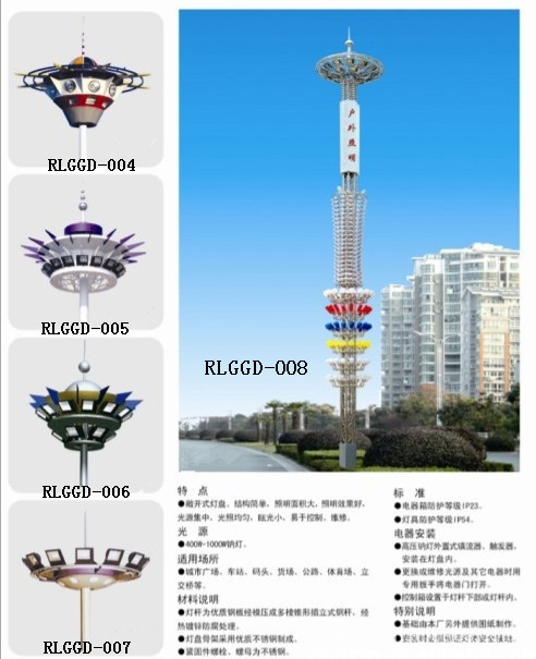高杆灯:一般指15米以上钢制柱型灯杆和大功率组合式灯架构成的新型照明装置。它由灯头、内部灯具电气、杆体及基础部分组成。灯头造型可根据用户要求、周围环境、照明需要具体而定;内部灯具多由泛光灯和投光灯组成,光源采用NG400高压钠灯,照明半径达60米。杆体一般为圆柱型独体结构,用钢板卷制而成,高度为25—40米指25米以上钢制柱型灯杆和大功率组合式灯架构成的新型照明装置。它由灯头、内部灯具电气、杆体及基础部分组成。灯头造型可根据用户要求、周围环境、照明需要具体而定;内部灯具多由泛光灯和投光灯组成,光源一般采用高压钠灯和金卤灯。,照明半径达60米。杆体一般为圆柱型独体结构,用钢板卷制而成,高度为15—40米。