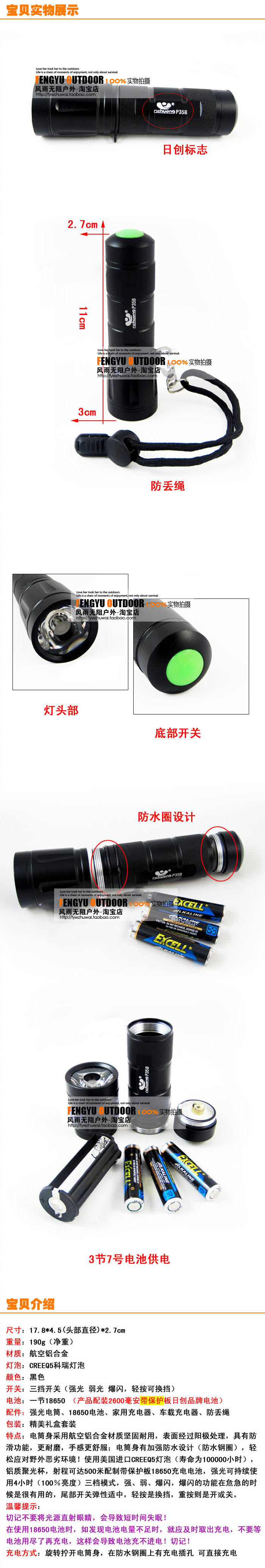 日创P35B 流明3W手电筒 铝合金 超亮小手电 送防丢绳