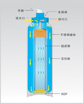 3、 全屋净水机和中央净水机的流量从500L/H到3000L/H不等,其主要结构为不锈钢承压外壳加超滤膜。市政自来水进入超滤系统后,在水压的作用下、净化水和对人体有益的矿物质从超滤膜管壁渗出,细菌、铁锈、胶体、悬浮物等物质则被截留在膜管内,在用户使用(作生活杂用)时,从冲洗水出口直接排出,由于采用垂直交叉错流过滤方式,能有效的进行清洗排污。本产品在大幅度的净水质的同时,解决了膜体脏堵的问题。