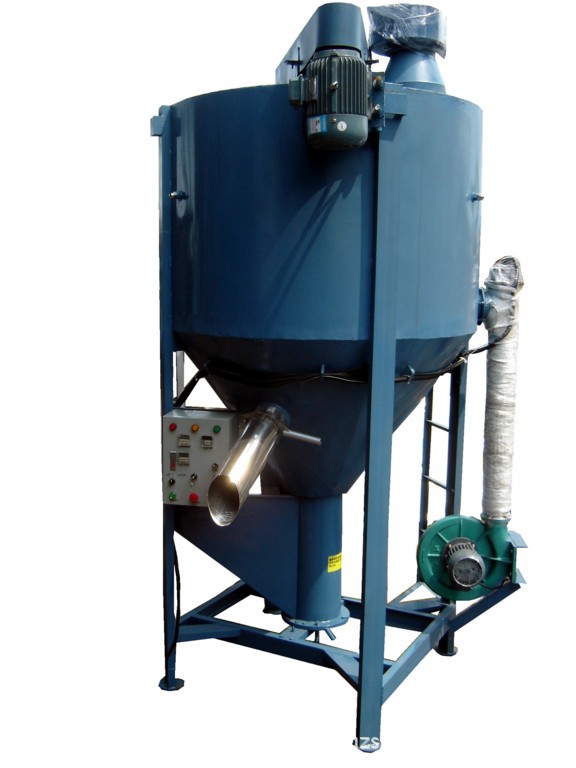 产品功能简介:主要通过电热风将物料表面及表层之水份烘干、排湿从而达到充分干燥的效果.本产品设计为两段快速上料,第一段将原料从料斗快速进入桶内,第二段再将原料快速螺旋至桶体上端,以伞状飞抛撒落,热风则从桶体下端的中心向四周吹出,从原料的间隙向上穿透,进行全面的热交换,动态干燥过程,由于桶内不停在翻滚加热干燥,从而达到了既快速混合又干燥的双重效果,如只需混合,那么只需关闭加热按钮即可,具有一机两用之功能.