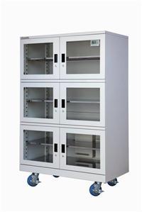 1.采用全新改良的大型除湿机芯,除湿高效快速,开机空运转2小时,湿度即可降低至20%RH以下,最低湿度可达3-5%RH以下,即使遇到断电,24小时仍然继续除湿,湿度上升值低于10%RH.2. 特有强制循环除湿机芯配置,加速除湿效率,适合需经常开门取放物品,(如表面贴装的半导体IC、MSD部品等)3.控制面板增设强制除湿按钮,开门取放物品后,柜内湿度升高,按此键可以进行强制除湿,使柜内快速恢复低湿水平。4.常温、静音、无震动,可长时间稳定运转。5.上下空间可调的冲孔层板设计,柜内空气加快循环,层板加强设计,可负荷重量100KG/块。6.ESD型号为具有防静电功能,适合存放需防静电对策的怕潮半导体部品,防静电对策:A: 柜体采用特殊导电喷漆,其表面电阻率为106-109B: 除湿机芯加装IMC接地电阻,使用安全放心C: 不锈钢层板配置。定做系列 根据的使用不同,可提供湿度5%至50%RH,超低湿防潮柜设计订造,另外在箱体的外侧增加充氧(N2)调节装置即成充氮防潮柜,也可以为低湿型防潮柜提供防静电设计制造。