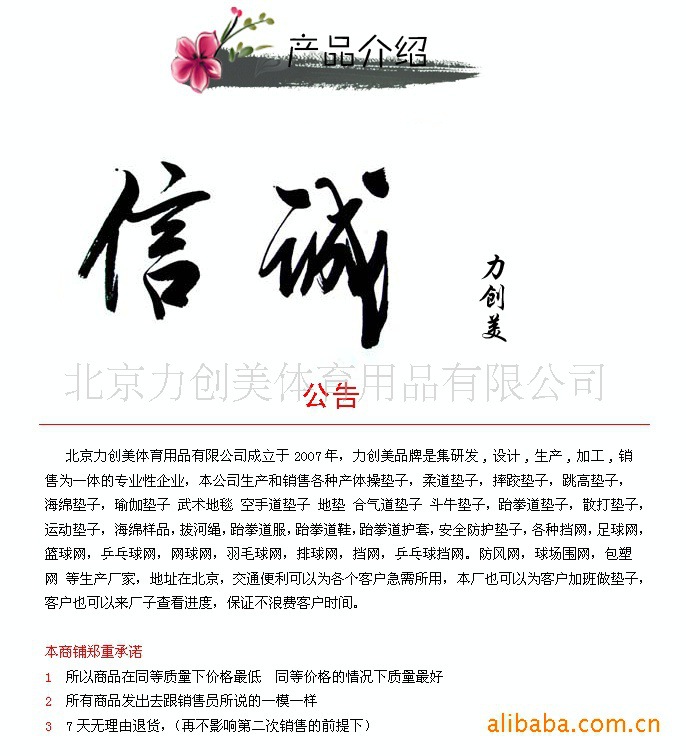 北京力创美体育用品有限公司成立于2007年,力创美品牌是集研发,设计,生产,加工,销售为一体的专业性企业, 本公司生产和销售各种产体操垫子,柔道垫子,摔跤垫子,跳高垫子,海绵垫子,瑜伽垫子 武术地毯 空手道垫子地垫 合气道垫子 斗牛垫子,跆拳道垫子,散打垫子,运动垫子, 海绵样品,拔河绳,跆拳道服,跆拳道鞋,跆拳道护套,安全防护垫子,各种挡网,足球网,篮球网,乒乓球网,网球网,羽毛球网,排球网,挡网,乒乓球挡网。防风网,球场围网,包塑网等生产厂家,地址在北京,交通便利可以为各个客户急需所用,本厂也可以为客户加班做垫子,客户也可以来厂子查看进度,保证不浪费客户时间。