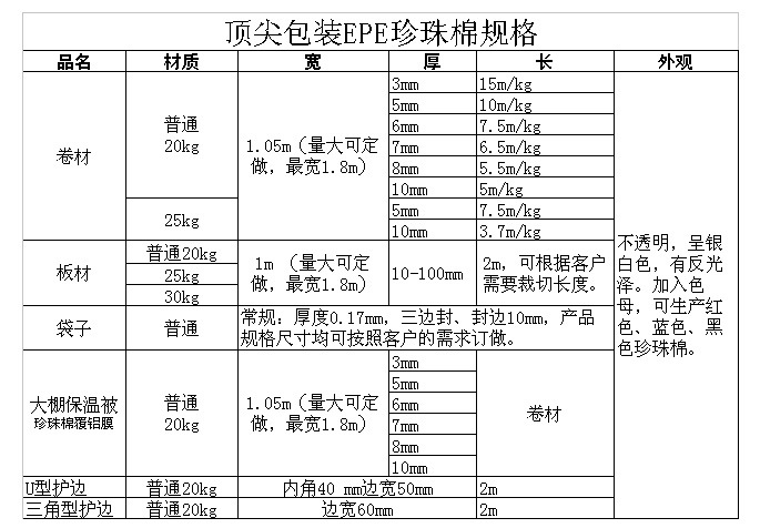 EPE珍珠棉板材:厚度6-100mm,宽度1-1.5m,是由珍珠棉卷材复合而成,主要用于异型材深加工。