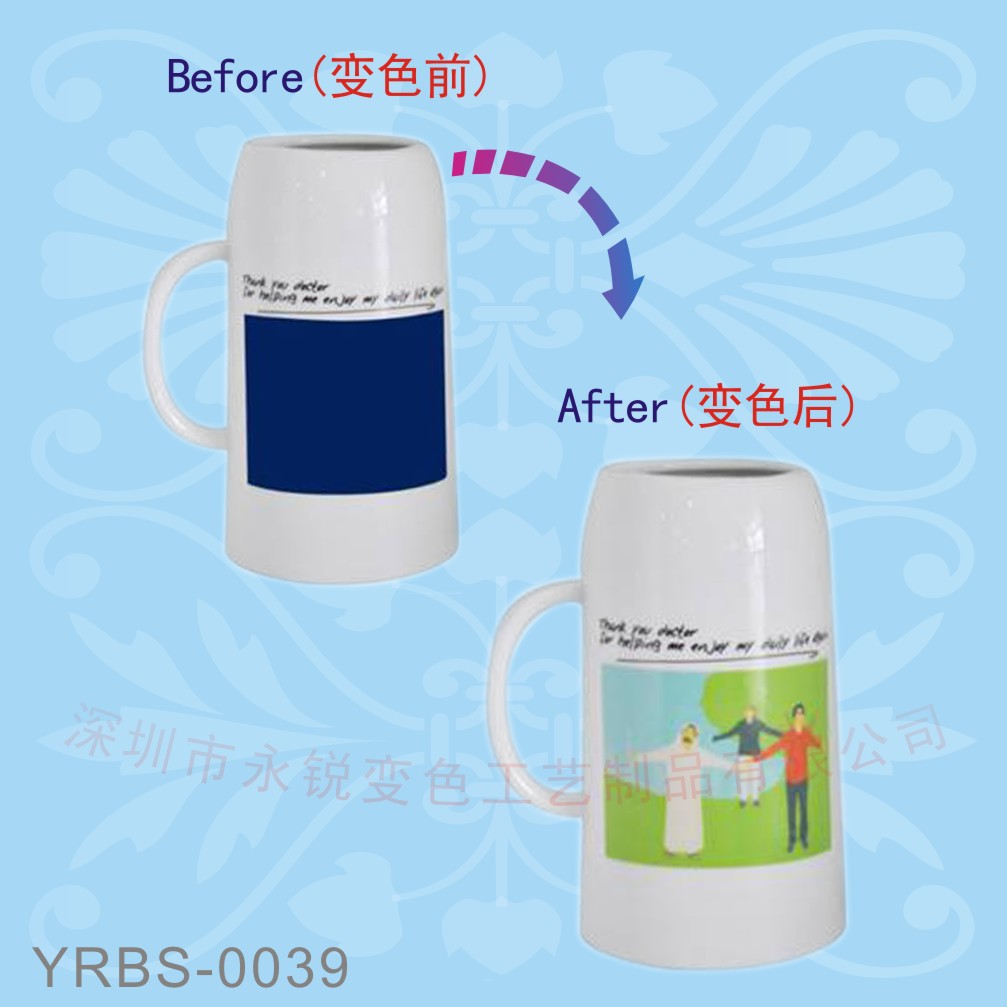 变色杯,又称魔术杯;即在杯子里注入热水/冷水,杯体将会发生颜色变化,在没有变色之前的颜色有黑色、咖啡色、红色、蓝色、绿色等或其它定制图案及LOGO,包括网点效果,都可以设计成变色杯表面层。变色后出现您想要的照片、公司LOGO、产品图片、纪念照片等,只要您能想到的我们都能做到。