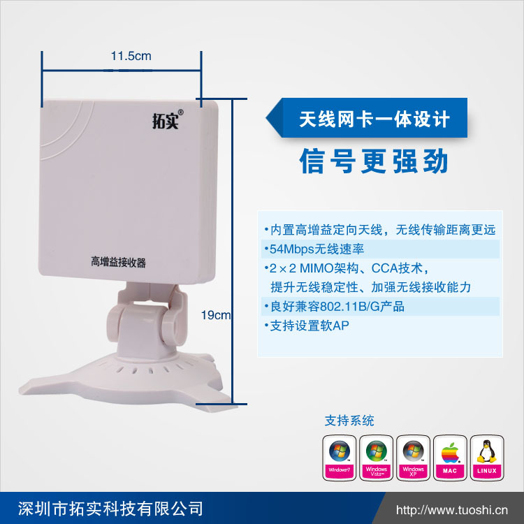 2.内置台湾Realtek54M 高速芯片,搭配高增益定向传输天线,信号传输能力倍增,店主实测已经是同类信号接收最好的款式之一,欢迎测试对比。