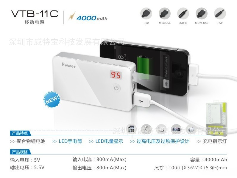 VTB-11C数码管电量显示外形超薄、时尚,面板采用抛光镜片,光泽度好;内置4000毫安时高容量的A品聚合物锂电池,充电性能快速、安全;双LED灯可做照明,方便实用。