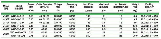 V550F(WQ5-7-0.55)快捷污水潜水泵的性能参数表: