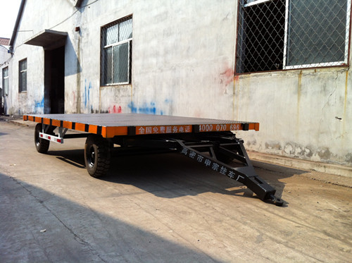 平板拖车特点: 1、采用高弹性实心胎,能增强拖车的承载能力,提高使用寿命,采用空气胎则能减轻行驶过程中因路面颠簸对货物造成的损伤;采用压配胎,因轮胎高度较 低,加强了整车的稳定性和拖车的承载力。尤其适合大宗模具的搬运。2、采用双悬浮式结构,悬浮式车架,轮轴自动摆动调节,保证在凸凹地面,保证车体水平且轮胎受力均衡。提高运输过程中的安全性。3,连接部位的销轴材料采用合金钢,经特殊工艺处理,提高使用寿命。4、采用双轨道工机回转机构形式,性能更稳定。5、牵引龙头上下可调节固定,不同吨位的牵引头或叉车牵引时只需简单调节即可联系人:付连军手机:13869617588
