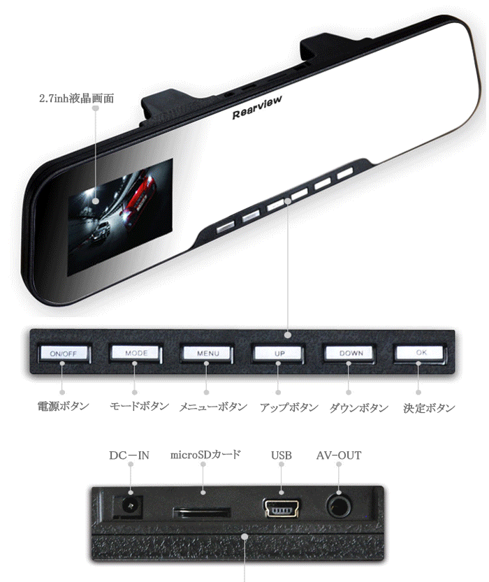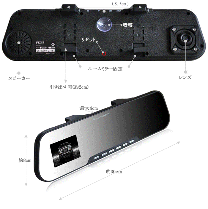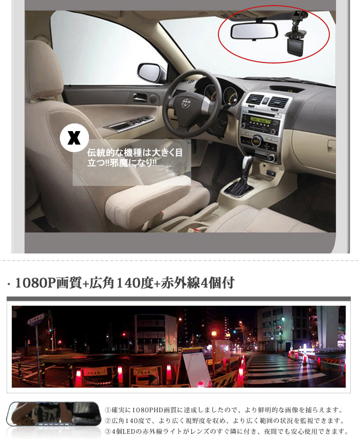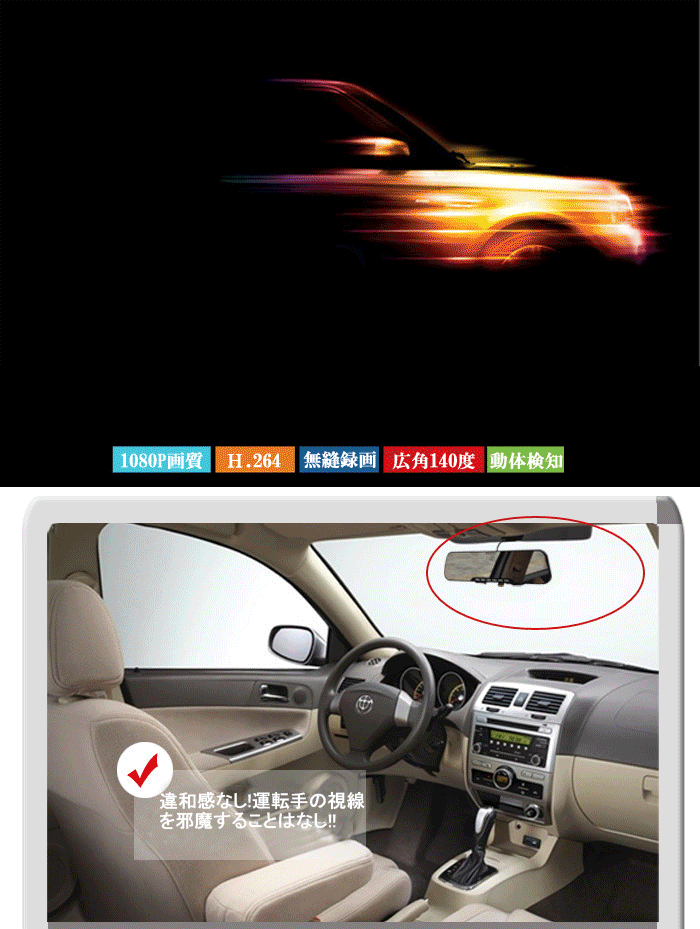 ◎ルームミラーと一体化するデザインです。 ◎何とかしてドライブレコーダーとしても1080P画質に達成しました。1080P/720P/WVGA/QVGAの間に切り替え可能です。