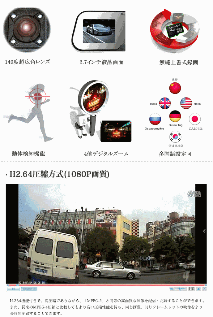 ◎H.264機能付きで、高圧縮でありながら、「MPEG-2」と同等の高画質な映像を配信?記録することができます。また、従来のMPEG-4圧縮と比較してもより高い圧縮性能を持ち、同じ画質、同じフレームレットの映像をより長時間記録することできます。 ☆HD720P画質(1280*1440)対応で、写真でも録画でも非常に満足できます。