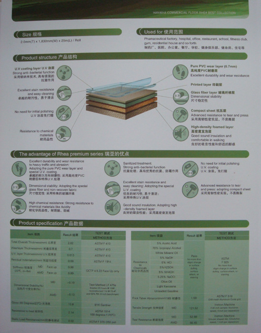 韩华地板经广泛的化学测试,表现稳定,没有色彩的变化,这是因为材质选用纯PVC作为表层,表面经抗菌处理,及聚胺脂涂层处理。