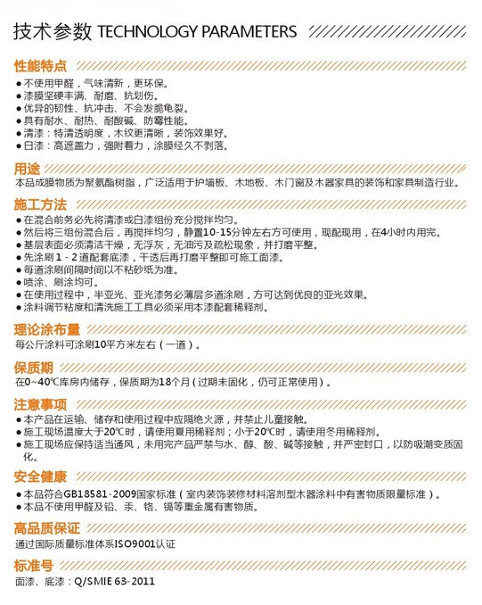 产品用途:本品成膜物质为聚氨酯树脂,广泛适用于护墙板、木地板、木门窗及木器家具的装饰和家具制造行业。