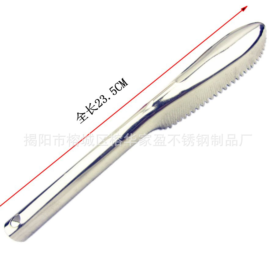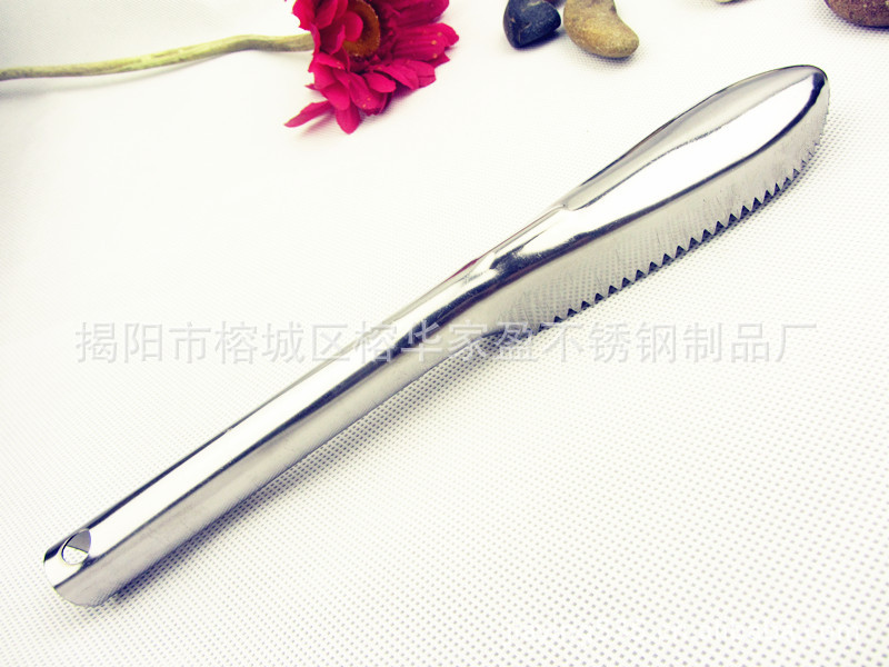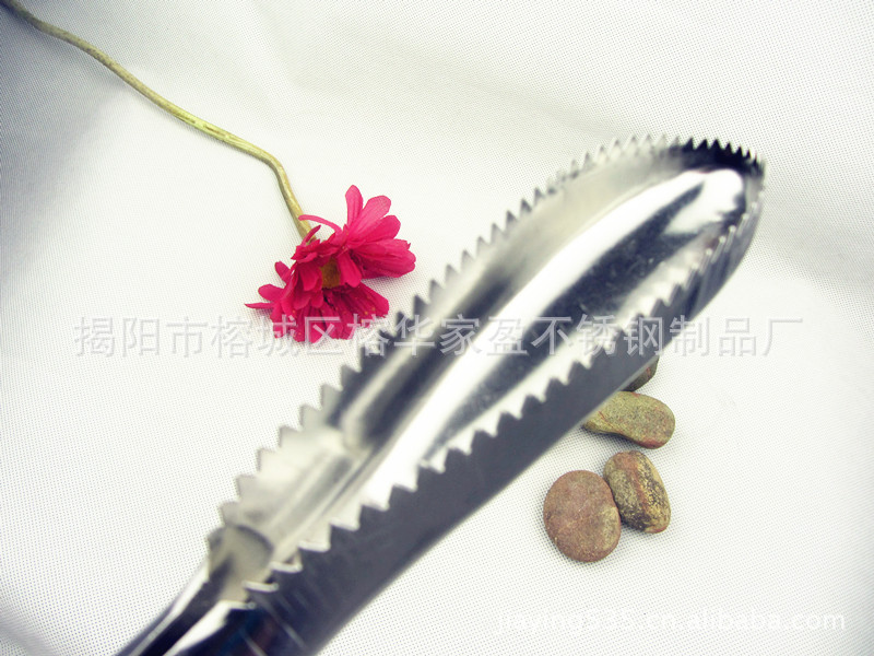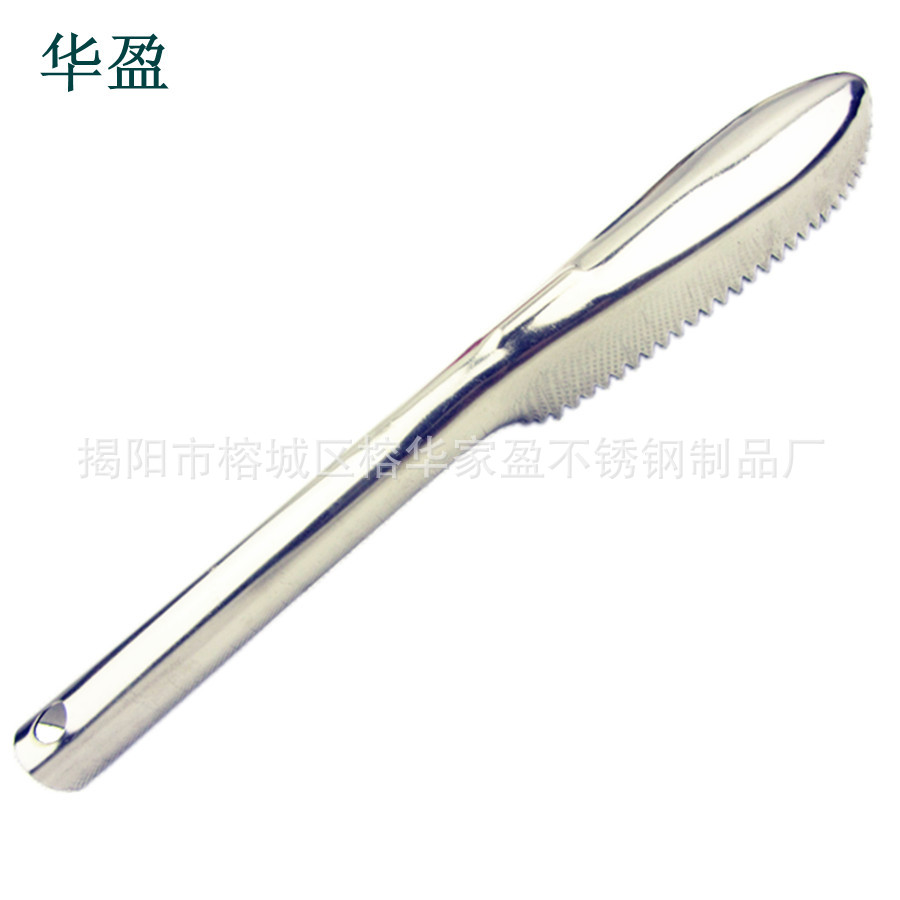 1、揭阳家盈不锈钢制品厂生产此款华盈牌圆头圆柄不锈钢鱼鳞刮 使用方便,快捷刮去鱼鳞。