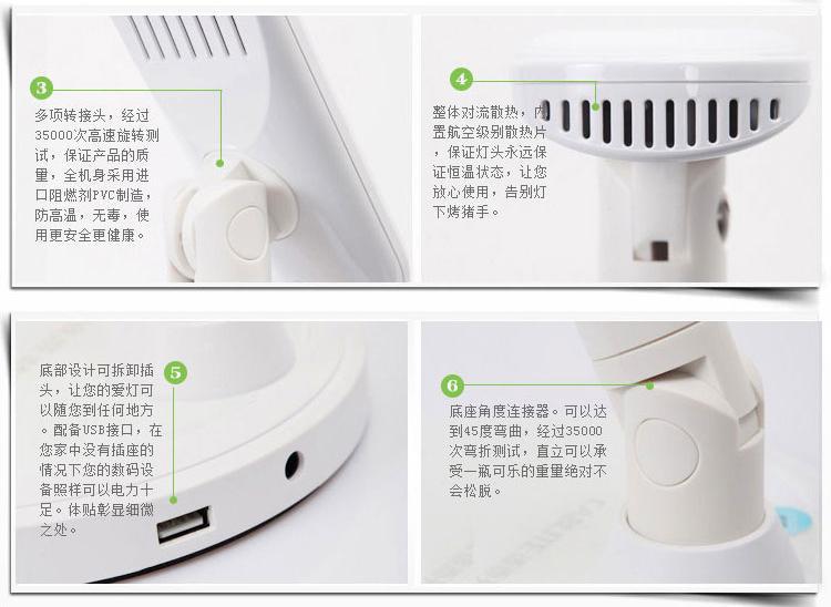 产品介绍: “金光万道滚红霓,瑞气千条喷紫雾”,传说中的天宫圣境永远是光明一片;适而亮天宫系列台灯T103ER带您走进一片光明世界 , T103ER是帝狼公司继T101/T102之后推出的又一款LED学习台灯,在采用专利柔光技术的基础上增加了多模调光及内置USB数码充电功能,是帝狼LED台灯设计往智能化、数码化方向发展的标志性产品。产品特点:1.专利侧发光技术,光线更柔和,更均匀;2.高亮度LED,光线更出色,无屏闪;3.多模式调光,根据环境选择照度模式;4.内置多功能USB接口,可供数码设备充电;5.环境温度变化自适应系统;6. 多种颜色可供选择(象牙白/玛瑙红/雅士黑);7.灯具壳体采用高强度防火塑胶材料,防腐、安全且易于清洁;8.绿色无污染,冷光灯设计,无热辐射,对眼睛和皮肤无任何伤害,不含铅,汞污染元素,实现了真正意义上的节能环保照明。9.启动无延时,即通即亮,无需等待,即可达到正常亮度;售后服务:1.本产品自购买之日起,光源保修2年,电源适配器保修1年;2.所有不当使用或私自更改产品而导致的灯具或人身伤害,制造商不负任何责任。