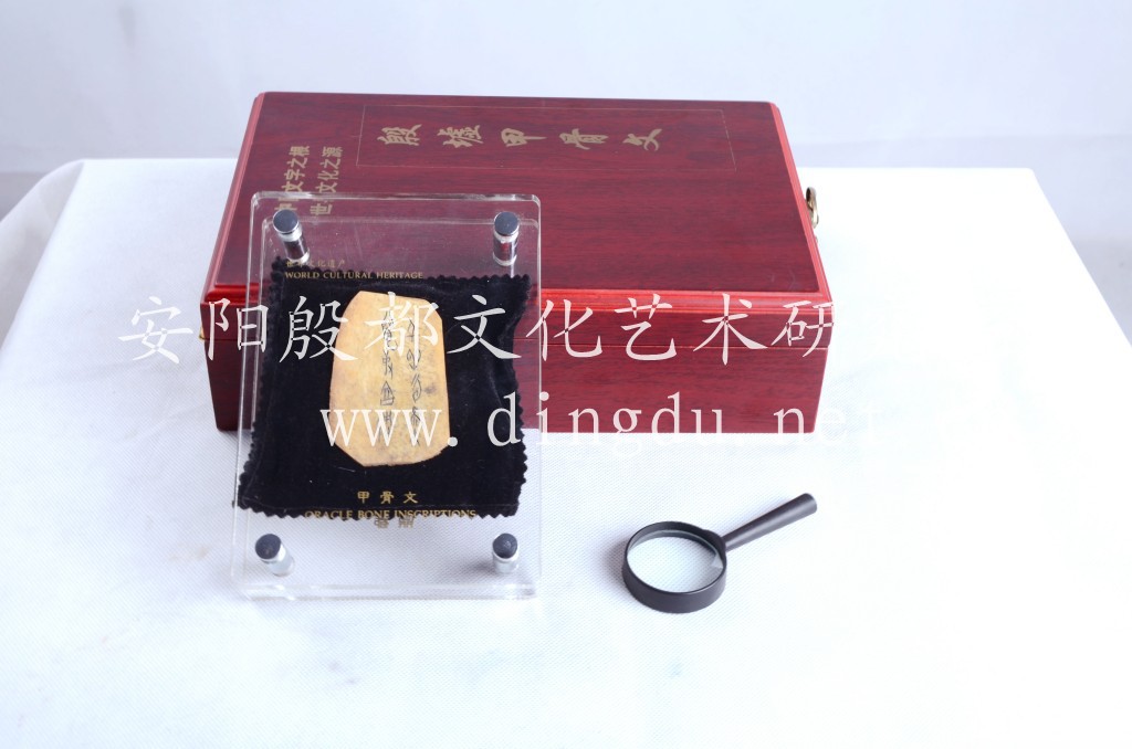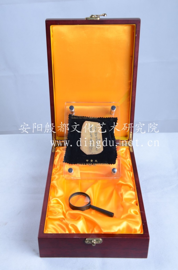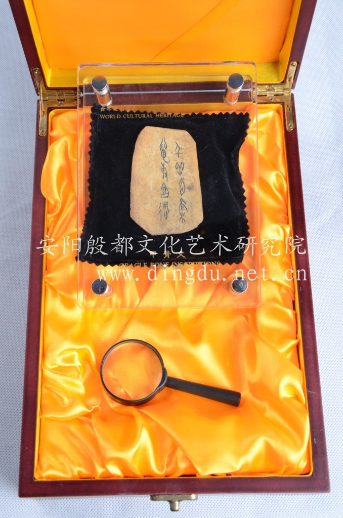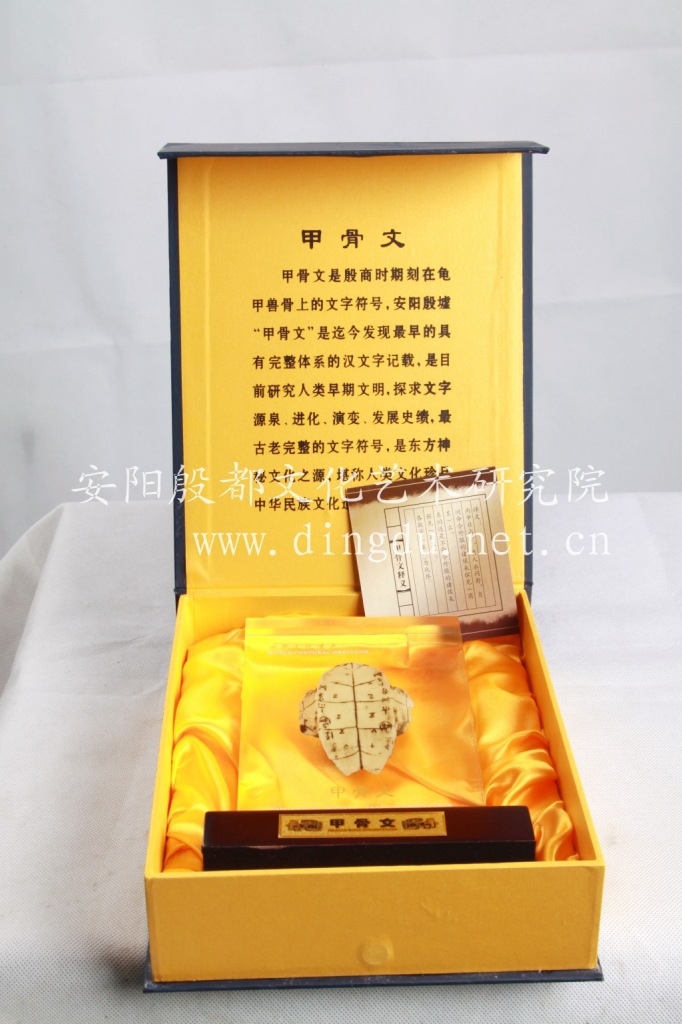 安阳殷都文化艺术研究院,地处世界文化遗产地——安阳殷墟,专业仿制各种甲骨文、制作各种精美甲骨文礼品。“鼎都”牌甲骨文由甲骨文专家亲手精雕细琢,集收藏与观赏于一身,每件仿品无论外观还是质量上都能与原物媲美,神形兼备,文化厚重,使之不仅仅是工艺品、艺术品,更承载了5000年的中华民族文化、殷商文化之灵气,具有很高的欣赏价值与实用装饰价值。我院仿制的甲骨文曾被多家国家级博物馆收藏。我院也可根据客户要求,定制各种内容的甲骨文。可作为会议礼品、商务礼品、馈赠亲友等。