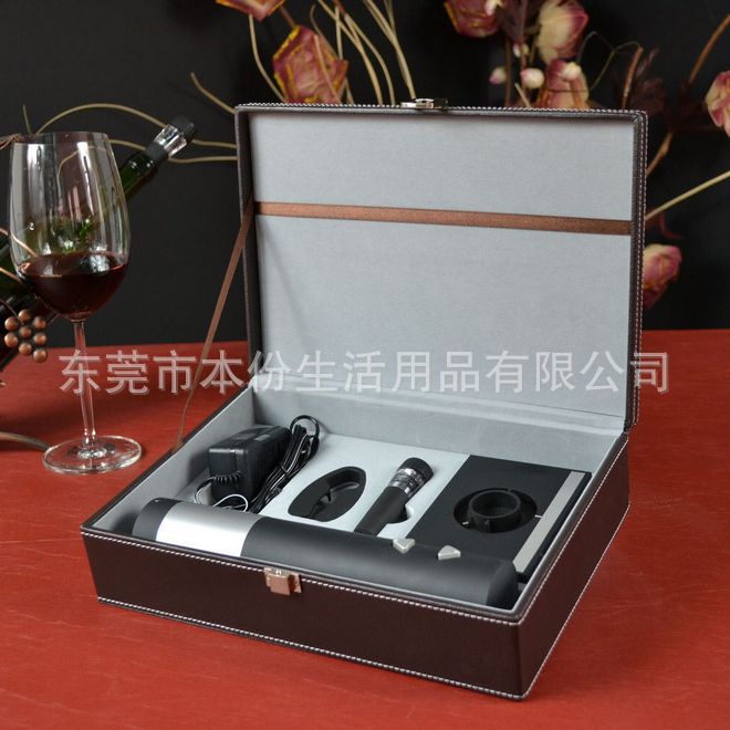 产品配置:PU高档皮盒+电动开瓶器+割纸器+真空酒塞+充电底座+电源线。