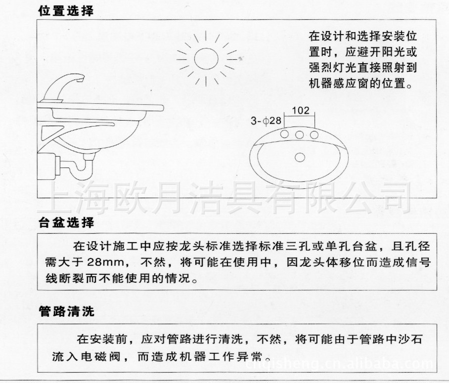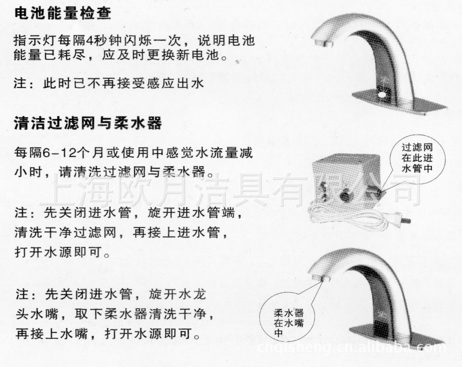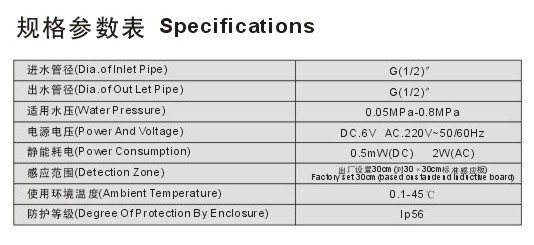 智 能:机器采用微电脑控制,自动设定最佳感应距离,无须人为调整,具有抗光线和紫外线功能,避免误出水,另外还设有60秒超时洗涤功能,避免异物长时间在感应范围内而造成水资源浪费。