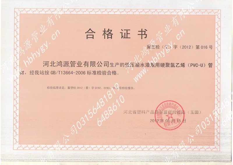 PVC-U低压输水灌溉用聚氯乙烯管材应用范围:适用于农业喷灌、微灌、渠道防渗、低压管道输送等