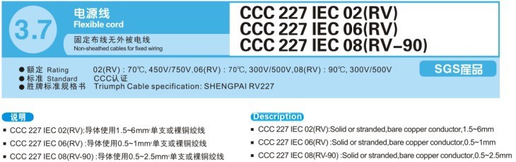 胜牌工厂现货库存低价直销3C国标08(RV-90)1.5mm平方单支电源线