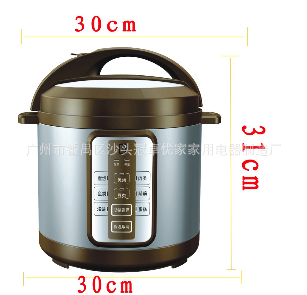 智能型电压力煲是采用最新技术研制开发的一种新型炊具。它优化集合了压力锅、电饭锅、焖烧锅的优点于一体,并弥补了众锅的不足。采用人性化操作面板设计,结构先进,造型新颖,是现代家庭的理想炊具。也是压力锅,电饭锅,焖烧锅的升级换代产品,产品具有如下特点: