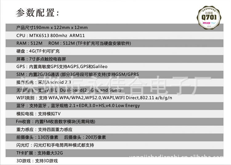 7寸平板电脑、厂家直销MTK方案、安卓2.3系统,3G+WIFI+GPS+TV