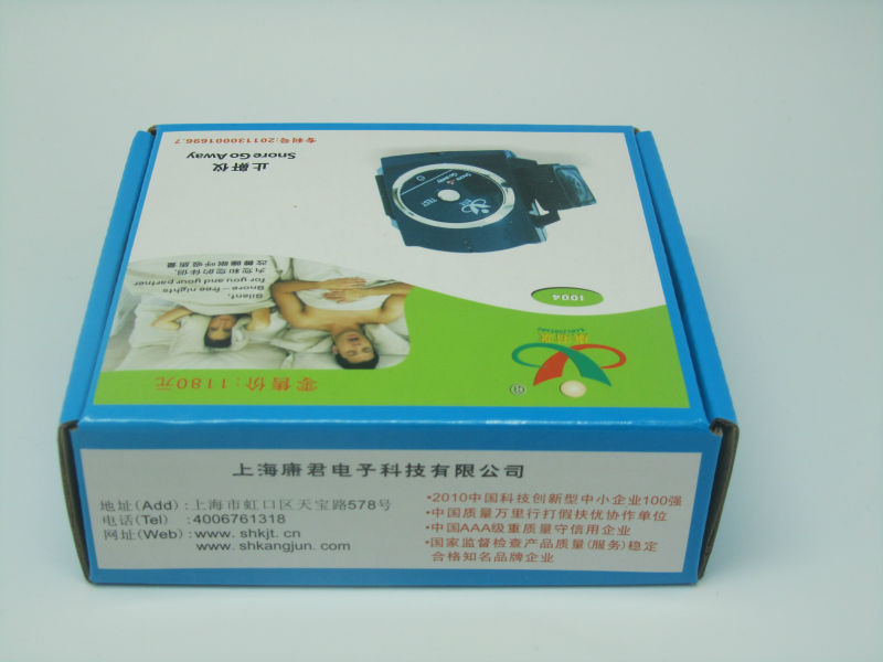 腕式电子止鼾器是一项采用生物回馈的自我训练模式。来降低或减少打鼾行为的一种物理康复仪器。它的过程是透过止鼾器上的微型生物声频侦测器,在侦测超过70+5dB的鼾声10=1秒以上,控制IC即启动脉冲输出机制,以温和的可调的电子针灸方式,透过皮肤送达运动神经,再不吵醒使用者的前提下,促使使用者因反射作用产生变换睡姿,达到抑制和减少打鼾的功效。本品还有省电功能设计,当超过30秒以上侦测不到鼾声时,则自动关机。而累积使用8小时以上即自动关机。只要持之以恒地使用本品,就能达到满意的效果。