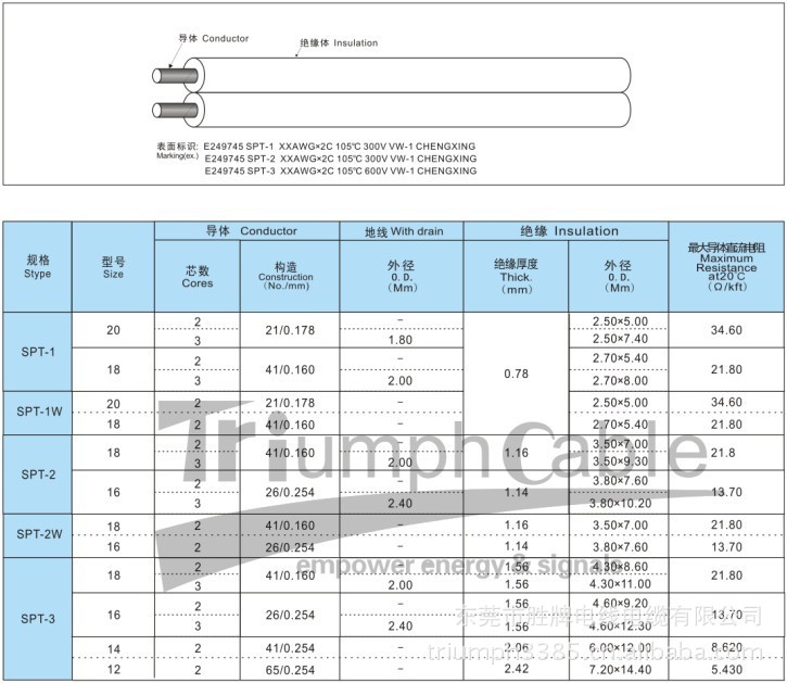 | UL SPT-3 系列2芯双并电源线详细规格 |