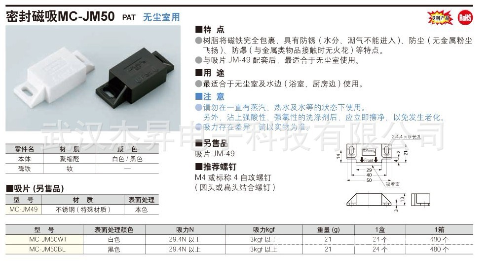 密封磁吸密封强磁力用于洁净室和水环境不含螺钉推荐螺钉尺寸:M4扁头螺钉吸片MC-JM49另售