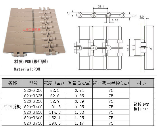 节距为38.1mm,宽度有82.6mm,88.9mm,101.6mm,114.3mm,152.4mm,190.5mm,254.0mm,304.8mm,我司同时供应链板配套链轮。适合用于各种食品,饮料,宝特瓶,铝罐,以及各类容器之输送。