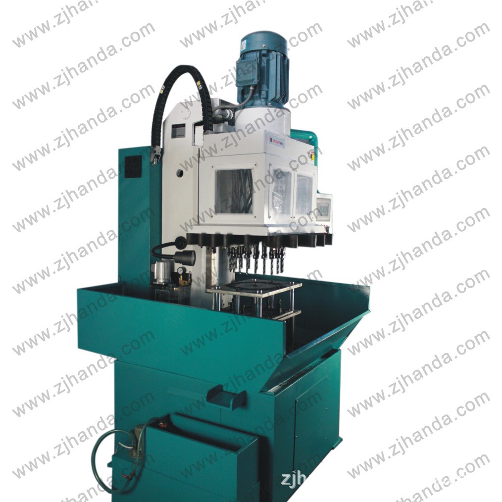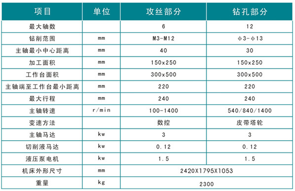 QK5413*12钻攻两用组合机床,在ZK5213系列产品上增加多轴攻丝机床,采用全自动PLC控制,光栅尺和伺服电机精密控制进给深度,操作界面简单易用。采用深孔加工程序,实现多段进给多次排屑。