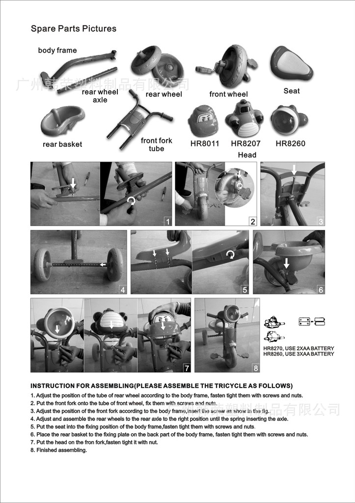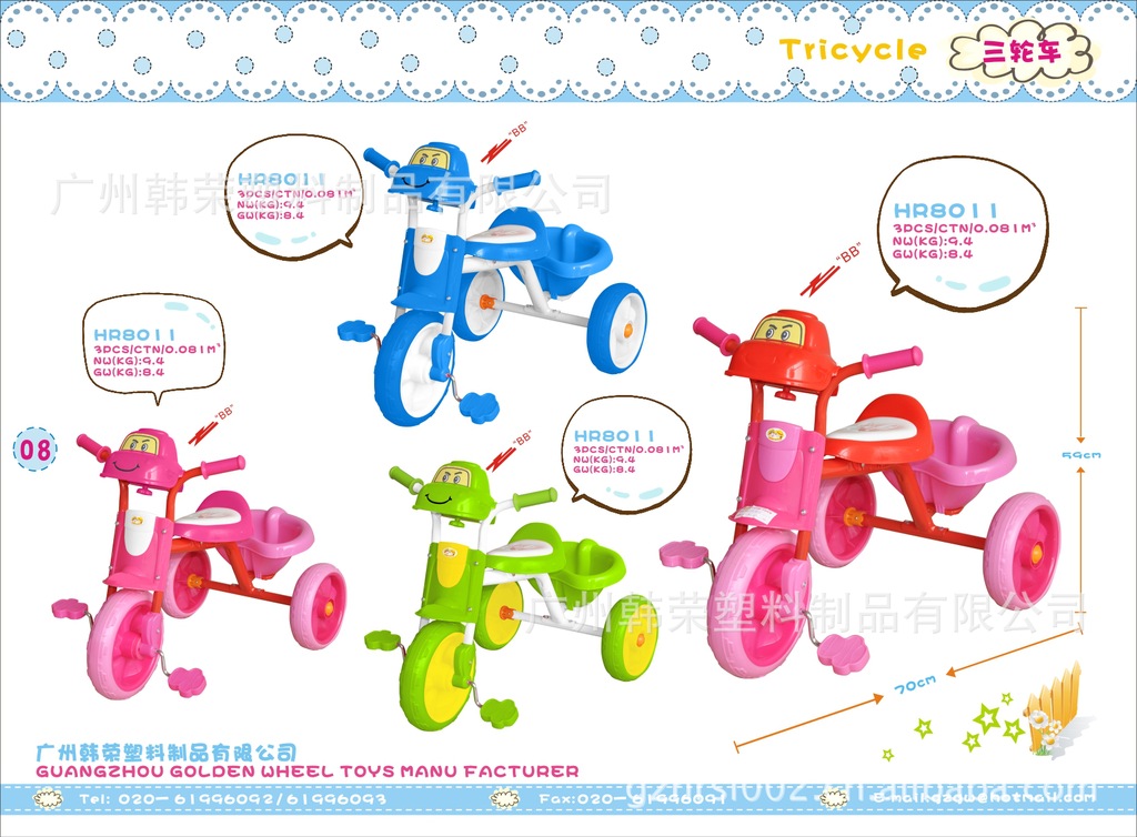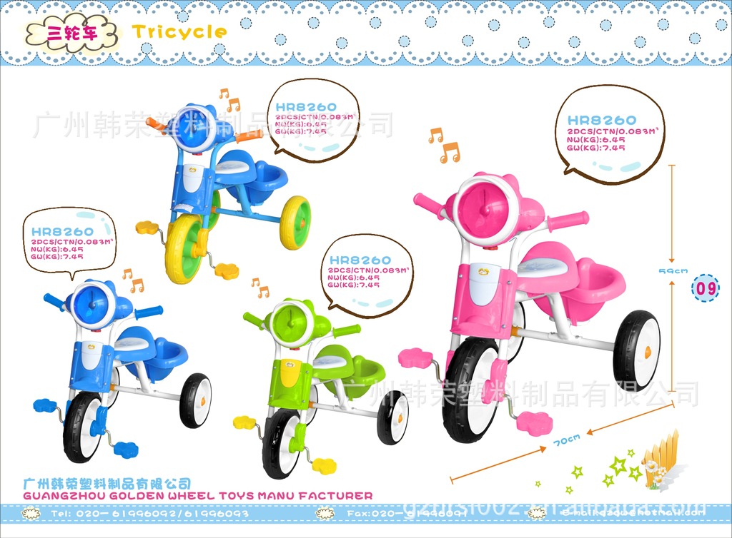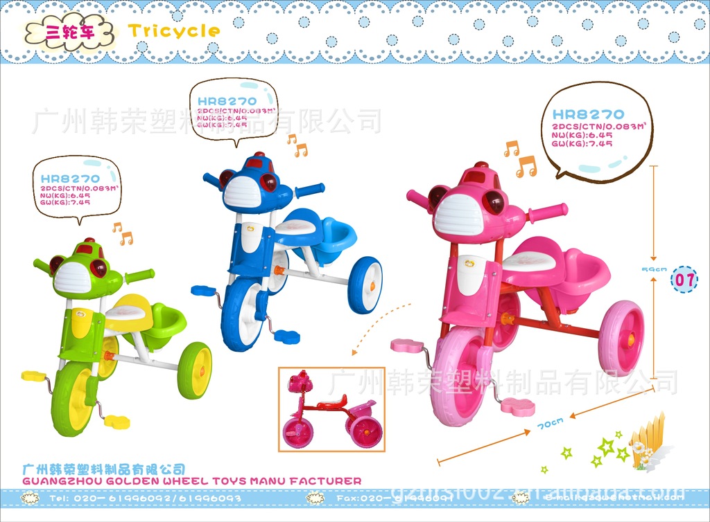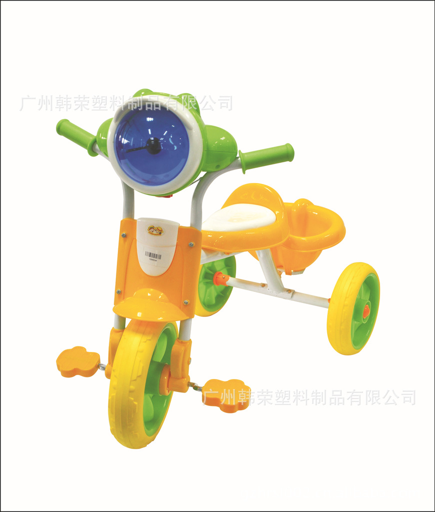 【优点】本产品使用无毒PP原料生产,拆装轻松方便,年轻妈咪也可轻松快快捷进行拆装。此车有6-12首音乐,同时配有LED灯光;车后有购物篮,是一款多功能高级儿童三轮车,很受欧盟、南美、中东、东南亚等小朋友的青睐。