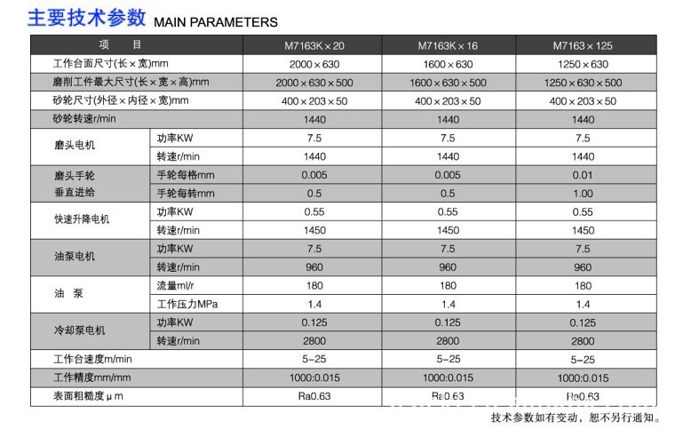本系列机床适用于机械制造行业磨削钢件、铸铁及有色金属等各种金属零件的平面。 特点:磨床工作台纵向移动和磨头横向移动为液压传动,无级调速;磨头垂直进给为手动,配有快速升降机构,能减轻劳动强度,提高工作效率;工作台导轨粘贴聚四氟乙烯导轨软带,耐磨性好,能耗低;磨头垂直进给导轨粘贴聚四氟乙烯导轨软带,进刀灵敏度高;机床床身采用热对称设计,热变形小;利用回油加热床身导轨,导轨直线度基本保持不变;机床运动平稳、性能可靠、噪音低,深受用户欢迎。