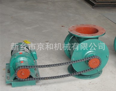 当变速时由蜗杆付通过装在同一主轴上的刮板,供给叶轮和测量叶轮实现给粉。煤粉自煤粉斗流入给粉机上部体内的隔板上及其缺口下面的供给叶轮的齿槽内,旋转的叶轮带着煤粉在供给叶轮壳内转180度给叶轮壳缺口处,落到测量叶轮内的齿槽,测量叶轮再转180度又把煤粉带部体内的缺口片,煤粉即落入出粉管中,按此过程就达到连续、均匀给粉的防止停机时煤粉自流的目的。