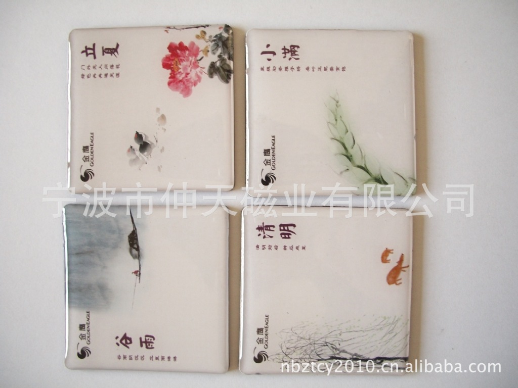 10)滴胶冰箱贴:采用下面软胶磁铁+上面铜版纸彩色印刷+滴胶腹膜制作而成