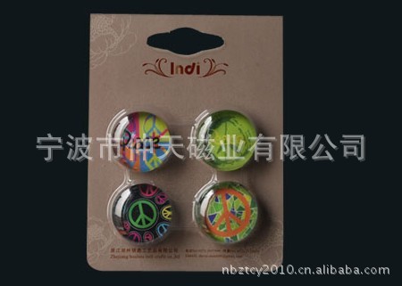 9)玻璃冰箱贴:采用下面软胶磁铁+上面铜版纸彩色印刷+半圆玻璃窗腹膜制作而成