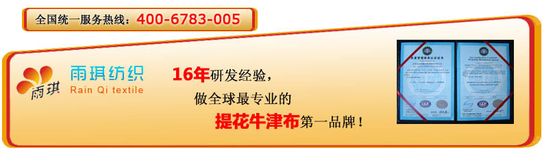 400-6783-005雨琪纺织集团公司是一家专业从事牛津布、耐磨牛津布、环保牛津布、TPE牛津布、TPU牛津布、提花牛津布阻燃、防火牛津布、抗紫外线牛津布,第一品牌。服务热线400-6783-005