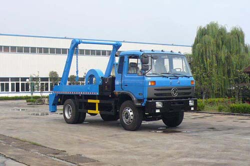 ★摆臂式垃圾车:由底盘、垃圾箱(斗)、摆臂减速缓冲油缸等组成,其特点是垃圾箱能与车体分开,实现一车与多个垃圾箱的联合使用。