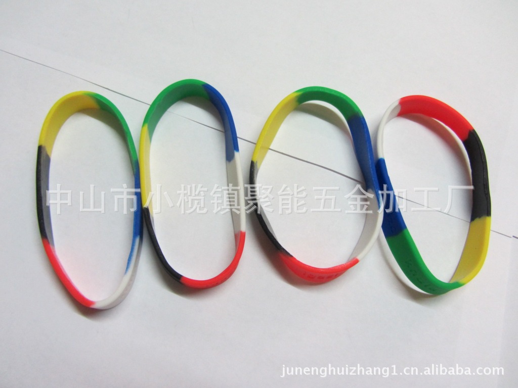 4.分段硅胶手环:此类手环即把不同色的胶料在一起同时成型,每个色段之间成型出分段手环,让本身的手环更加吸引眼球。