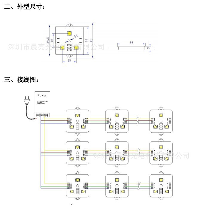 led贴片模组 相对食人鱼模组具有散热性好,发光角度大,亮度高,寿命长,低光衰,混光效果好等优势。主要使用与LED发光字,户外广告牌等。