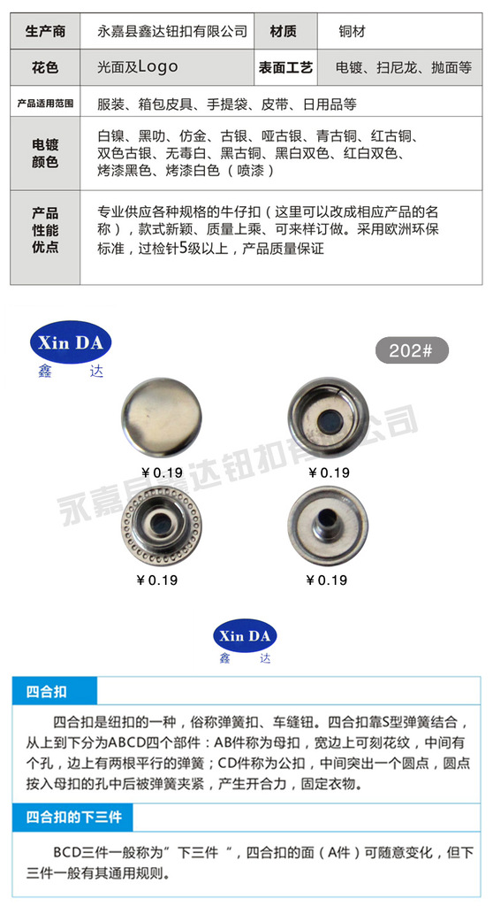鑫达钮扣,服装设计师的首选工厂。来样定做,一条龙的服务,让你没有任何后顾之忧。牛仔服装配件,以稳步发展,努力为国内外客户提供优质服务及物廉价美产品,信誉良好,深受客户的信赖。公司成立以来,一向致力生产经营各种服装配料及钮扣,主要产品有各类金属扣、四合扣、合金扣、工字扣、撞钉等服装配件。以稳步发展,努力为国内外客户提供优质服务及物廉价美产品,信誉良好,深受客户的信赖。