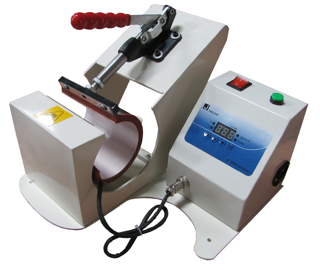步骤五:将打印好的纸裁切好,贴在杯子上,两端用高温胶条稍做固定,取出空白杯,再将裹有图片的瓷杯放于杯机6中,合上7手柄,按下3倒计时按钮,烫印开始。