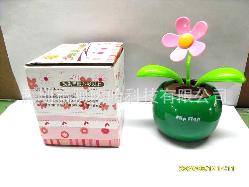 【产品介绍】:(红、粉红、绿、蓝、黑颜色可选) 1. 包装:彩盒包装; 2. 材质:ABS树脂、PVC外盒; 3. 产品旁边有个太阳能电池板,直接将阳光或灯光转换为太阳能,(无需任何外界电源,环保卫生); 4. 一种不错的选择,不用打理,只要一点点光,新的视觉,新的心情.精致的透明包装盒,实在让让人爱不释手,是家庭,办公室摆设,以及朋友送礼的最佳选择! 【商品说明】 温馨可爱的太阳能苹果花,放在车内仪表台上,在太阳能的作用下,两片绿色厚润的叶子和中心花朵会不停的左右摆动,趣味十足,为你的爱车增添独一无二的活力与气质。亦可作为室内、阳台、办公室的可爱装饰。在你心情烦躁的时候,看看欢快扇动的苹果花,可以帮助减压,将烦恼抛之脑后。 可爱的它无需任何电池动力,以太阳能为动力的设计让它实用、阳能为动力的设计让它实用、阳光之外,更显环保,且没有动力不足的后顾之忧,助您驾驶拥有一份好心情。 【使用方法】 ★放置于车内仪表台防滑垫上,或者使用双面胶固定。 ★请先放置在自然光下一段时间,让公仔充分均匀吸收能量。 ★太阳能花不是时时刻刻都在摆动,休息一下也是正常的,有点儿小风、小振动,它也会摆动起来哦!