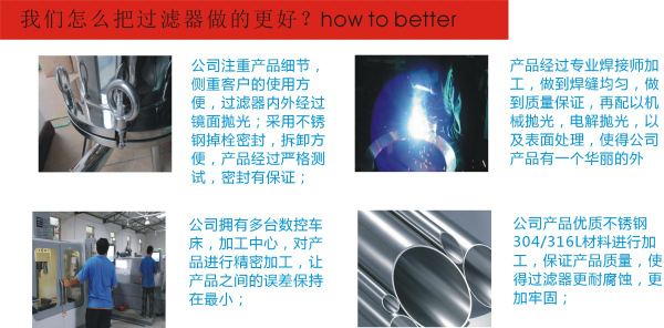 采用符合国际标准的不锈钢材料加工,所有与料液接触的部位都采用SUS304或SUS316L制作,并经过机械或电解精抛光,可提供优秀的耐久度和抗腐蚀能力;过滤器经过多道生产工艺,无死角,不泄露,设计合理;过滤流量小,适用小批量生产和加工!