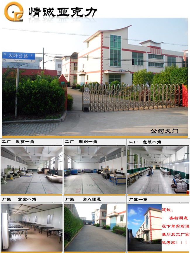 情诚亚克力为国内亚克力(acrylic,压克力,有机玻璃)制品工艺加工第一品牌,创始于一九九七年底,情诚亚克力制品定位为中/高档,为国内外优秀品牌提供服务,一直致力于亚克力(acrylic,压克力,有机玻璃)制品工艺创新,引领行业发展、潮流更新,在国内大多企业诚信欠佳的情况下,公司坚持走诚信路线,把“情义待人,诚信经商”作为至上理念,以情待人,留住一大批优秀的亚克力专业制作人才,公司骨干均为8年以上老将;诚实守信,从不偷工减料,材料,品质,价格均摆在明处,以优良品质\\超高的性价比\\诚信服务赢取了众多买家的信任与支持!