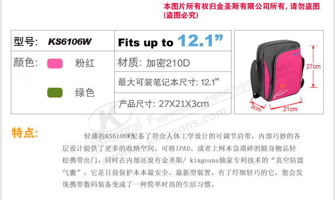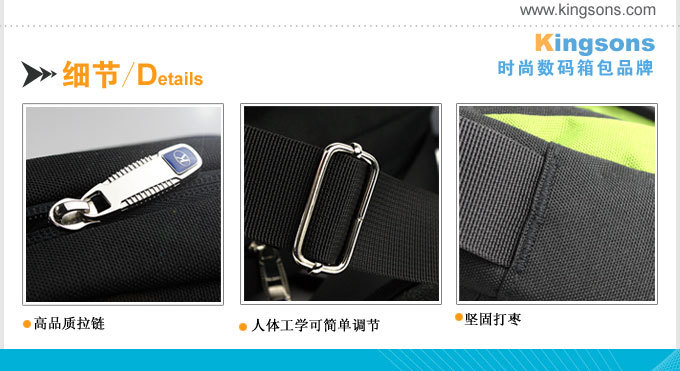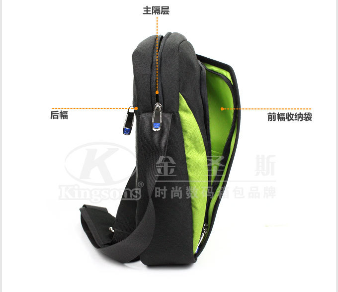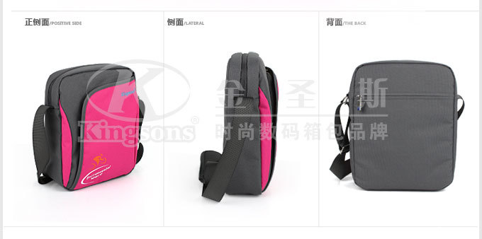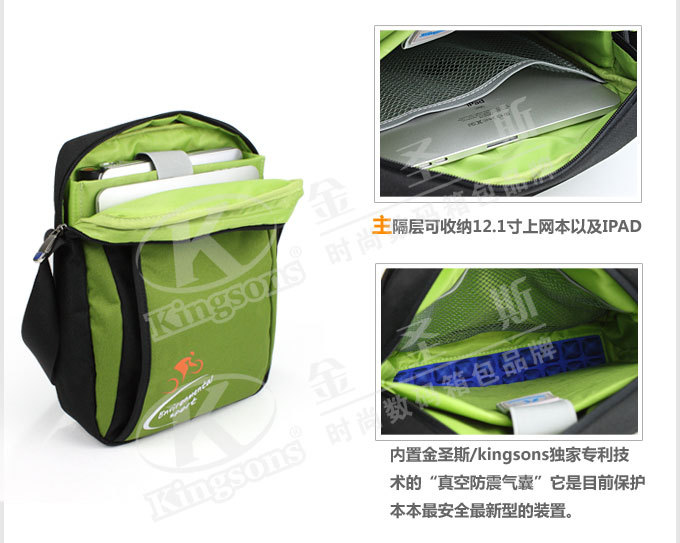 3、包包设计时尚休闲,有让人眼前一亮的新鲜感,同时包包设计还使用了金圣斯独家专利“真空防震气囊”,能更好的防震、防撞,使用更安全。